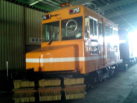昭和24年に製造された車両です。毎年冬になると、ブルームと呼ば れる竹のササラを回転させ線路の雪を除雪します。また、ササラ電車は 冬の風物詩ともいわれ、冬の間は線路の安全を守っています。 |