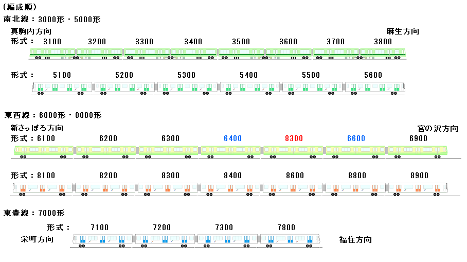 地下鉄の現役車両の形式は、南北線:3000形・5000形、東西線:6000形・8000形、東豊線:7000形の5形式が存在しています。また、引退した2000形(1000形)を含めば7形式になります。車両編成については、南北線3000形が5編成・5000形が17編成存在しています。