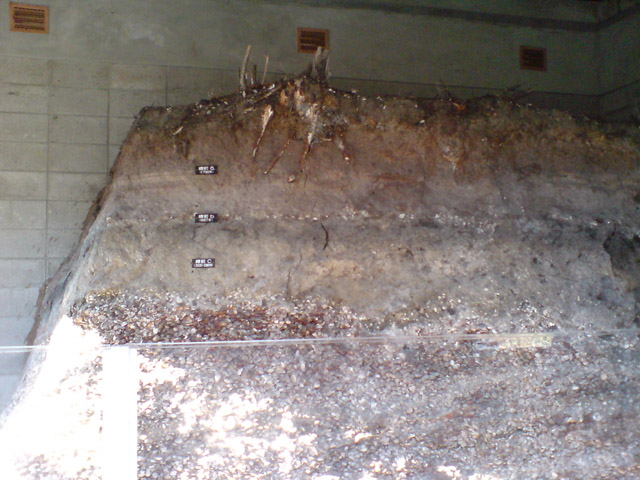 入り口から階段を上って少し歩いたところに、貝塚の展示施設があります。施設ですが 想像してたものより小さく、入り口に看板が掲げられていないのでパッと見倉庫と勘違 いしてしまいそうです^^