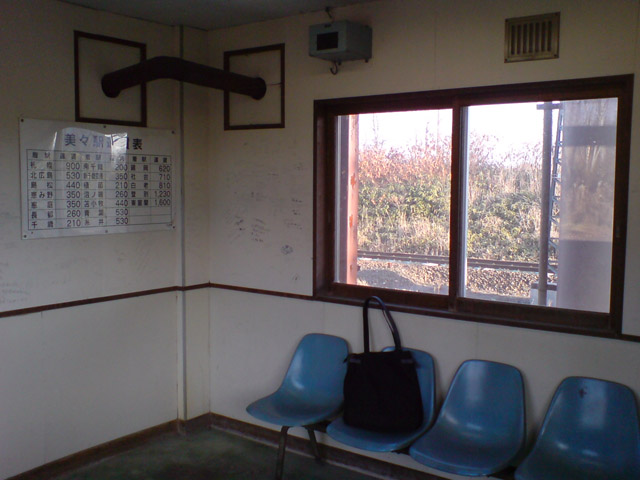 駅舎内です。室内は意外と綺麗なんですけど、所々に美々駅をネタにした落書き見ら れます^^;